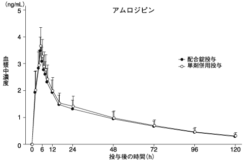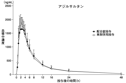 健康成人(18例)にアジルサルタン40mg及びアムロジピンとして5mgを単回単独投与及び単回併用投与した時注2)、アジルサルタン、アムロジピンのCmax、AUCに併用投与による影響はみられなかった16)。