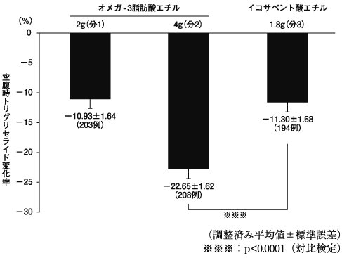 血清中トリグリセライドが高値の患者を対象に、オメガ-3脂肪酸エチルとして2g/日(1回2g、朝食直後)、4g/日(1回2g、朝食及び夕食直後)又はイコサペント酸エチルとして1.8g/日(1回0.6g、毎食直後)を12週間経口投与した実薬対照二重盲検比較試験を実施した。各群の空腹時トリグリセライドの投与前値(-4週、-2週及び0週の平均値±標準偏差)はオメガ-3脂肪酸エチル2g/日投与群で269.0±77.5mg/dL、4g/日投与群で277.5±97.3mg/dL、イコサペント酸エチル1.8g/日投与群で271.8±91.5mg/dLであった。オメガ-3脂肪酸エチル4g/日投与群とイコサペント酸エチル1.8g/日投与群の空腹時トリグリセライド変化率の差は−11.35%(-15.94−-6.76)〔点推定値(95%信頼区間)〕であり、有意なトリグリセライド低下作用が認められた(主解析)。また、オメガ-3脂肪酸エチル2g/日投与群とイコサペント酸エチル1.8g/日投与群の空腹時トリグリセライド変化率の差は0.37%(-4.25−4.98)〔点推定値(95%信頼区間)〕であり、非劣性(許容限界:7%)がみられた(副解析)5)。