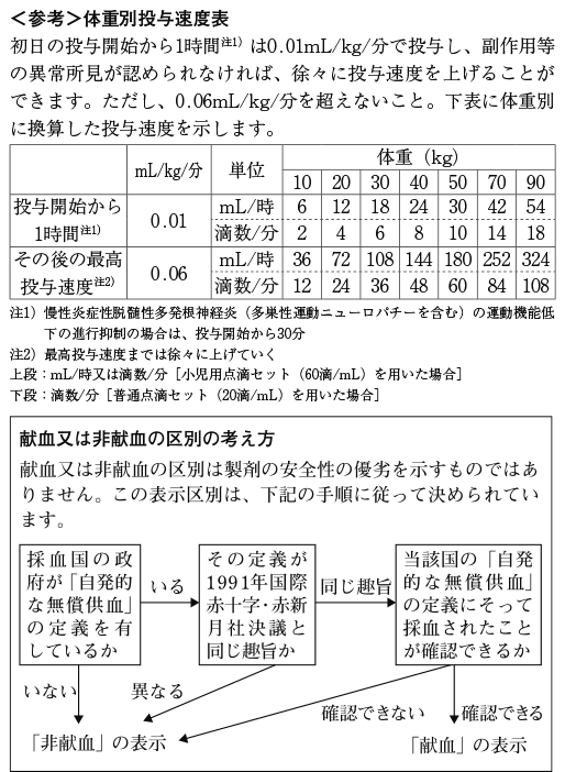投与開始から30分間は0.01mL/kg/分で投与し、副作用等の異常所見が認められなければ、徐々に投与速度を上げてもよい。ただし、0.06mL/kg/分を超えないこと。2日目以降は、前日に耐容した速度で投与する。