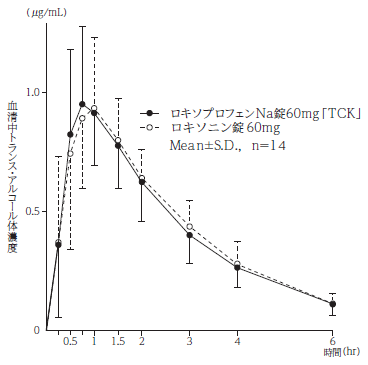 健康成人男性16例にロキソプロフェンナトリウム錠60mgを単回経口投与したところ、速やかに吸収され、血中にはロキソプロフェン(未変化体)のほか、trans-OH体(活性代謝物)の型で存在した。最高血漿中濃度に到達する時間はロキソプロフェンで約30分、trans-OH体で約50分であり、半減期はいずれも約1時間15分であった2)。