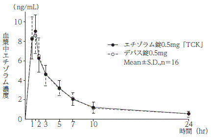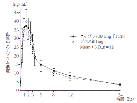 エチゾラム錠0.5mg「TCK」とデパス錠0.5mgを、クロスオーバー法によりそれぞれ2錠(エチゾラム1mg)健康成人男子に絶食単回経口投与して血漿中未変化体濃度を測定し、得られた薬物動態パラメータ(AUC、Cmax)について95%信頼区間法にて統計解析を行った結果、±20%の範囲内であり、両剤の生物学的同等性が確認された2)。