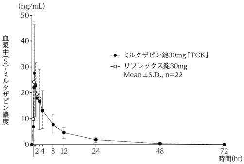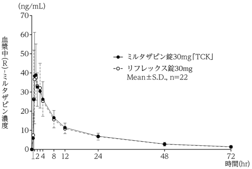 ミルタザピン錠15mg「TCK」は、「含量が異なる経口固形製剤の生物学的同等性試験ガイドライン(平成24年2月29日薬食審査発0229第10号)」に基づき、ミルタザピン錠30mg「TCK」を標準製剤としたとき、溶出挙動が等しく、生物学的に同等とみなされた21) 。