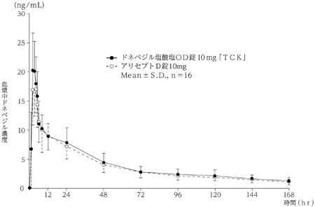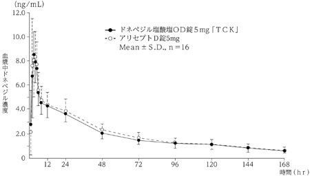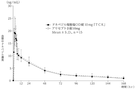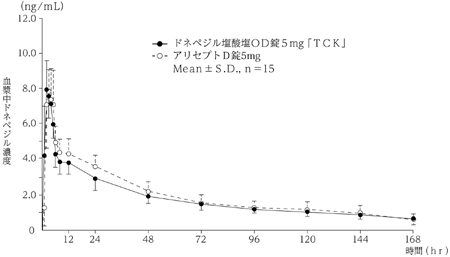 ドネペジル塩酸塩OD錠5mg「TCK」とアリセプトD錠5mgを、クロスオーバー法によりそれぞれ1錠(ドネペジル塩酸塩5mg)健康成人男子に絶食単回経口投与して血漿中未変化体濃度を測定し、得られた薬物動態パラメータ(AUC、Cmax)について90%信頼区間法にて統計解析を行った結果、log(0.80)〜log(1.25)の範囲内であり、両剤の生物学的同等性が確認された3)。