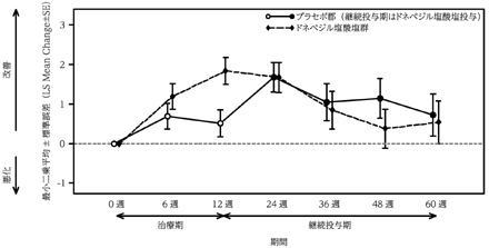 プラセボ群は12週からドネペジル塩酸塩錠3mg/日、14週から5mg/日、18週から10mg/日投与を開始(5mg/日への減量可)。投与群、時点、投与群と時点の交互作用を因子とし、MMSEのベースライン値及びスクリーニング期間の変化量を共変量としたMMRM(Mixed Model for Repeated Measures)。共分散構造は無構造とした。各評価時期(治療期及び継続投与期)におけるMMSEのベースラインからの変化量の推移