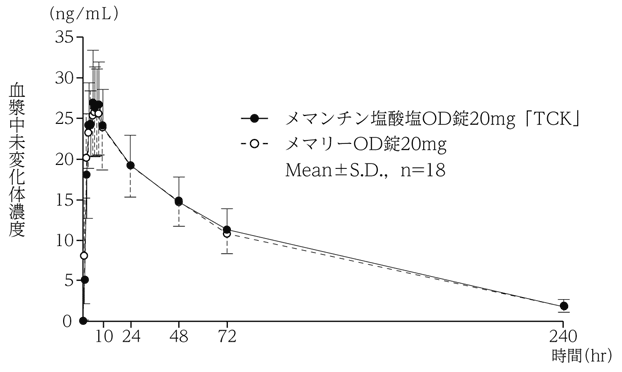 健康成人男性にメマンチン塩酸塩OD錠20mg(水なしで服用又は水で服用)又はメマンチン塩酸塩錠20mg(水で服用)をクロスオーバー法で空腹時単回経口投与したとき、いずれの場合も両製剤の血漿中濃度推移及び薬物動態パラメータは同様であった。メマンチン塩酸塩OD錠20mgは水なしで服用又は水で服用した場合のいずれも、メマンチン塩酸塩錠20mg(水で服用)と生物学的に同等であることが確認された3)。
