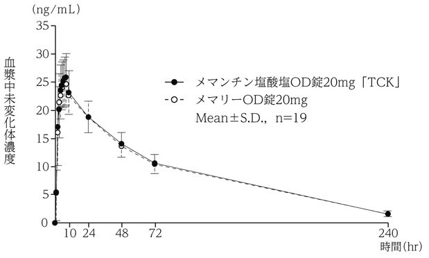 メマンチン塩酸塩OD錠20mg「TCK」とメマリーOD錠20mgを、クロスオーバー法によりそれぞれ1錠(メマンチン塩酸塩20mg)健康成人男子に絶食単回経口投与して血漿中未変化体濃度を測定し、得られた薬物動態パラメータ(AUC、Cmax)について90%信頼区間法にて統計解析を行った結果、log(0.80)~log(1.25)の範囲内であり、両剤の生物学的同等性が確認された5)。