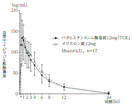 ベタヒスチンメシル酸塩錠12mg「TCK」とメリスロン錠12mgを、クロスオーバー法によりそれぞれ1錠(ベタヒスチンメシル酸塩12mg)健康成人男子に絶食単回経口投与して血漿中主代謝物2-ピリジル酢酸濃度を測定し、得られた薬物動態パラメータ(AUC、Cmax)について90%信頼区間法にて統計解析を行った結果、log(0.80)〜log(1.25)の範囲内であり、両剤の生物学的同等性が確認された1)。