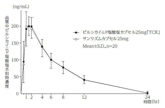 ピルシカイニド塩酸塩カプセル25mg「TCK」とサンリズムカプセル25mgを、クロスオーバー法によりそれぞれ1カプセル(ピルシカイニド塩酸塩水和物25mg)健康成人男子に絶食単回経口投与して血漿中未変化体濃度を測定し、得られた薬物動態パラメータ(AUC、Cmax)について90%信頼区間法にて統計解析を行った結果、log(0.80)〜log(1.25)の範囲内であり、両剤の生物学的同等性が確認された2)。
