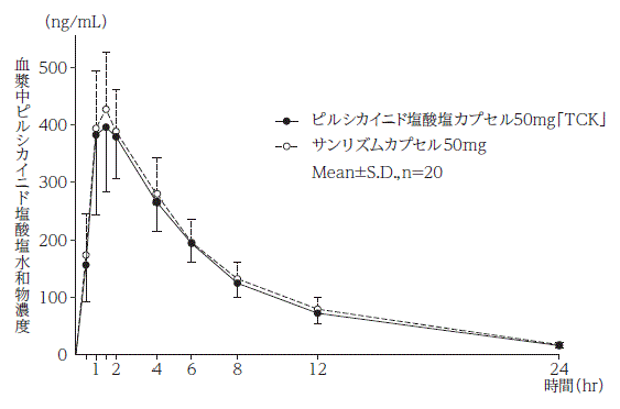 ピルシカイニド塩酸塩カプセル50mg「TCK」とサンリズムカプセル50mgを、クロスオーバー法によりそれぞれ1カプセル(ピルシカイニド塩酸塩水和物50mg)健康成人男子に絶食単回経口投与して血漿中未変化体濃度を測定し、得られた薬物動態パラメータ(AUC、Cmax)について90%信頼区間法にて統計解析を行った結果、log(0.80)〜log(1.25)の範囲内であり、両剤の生物学的同等性が確認された3)。