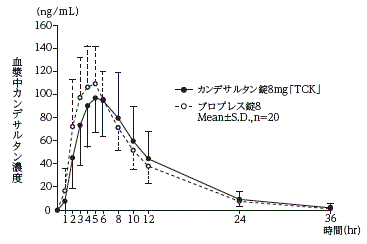 カンデサルタン錠8mg「TCK」とブロプレス錠8を、クロスオーバー法によりそれぞれ1錠(カンデサルタン シレキセチル8mg)健康成人男子に絶食単回経口投与して血漿中活性代謝物濃度を測定し、得られた薬物動態パラメータ(AUC、Cmax)について90%信頼区間法にて統計解析を行った結果、log(0.80)~log(1.25)の範囲内であり、両剤の生物学的同等性が確認された7)。