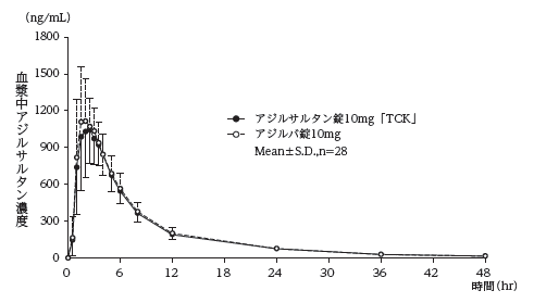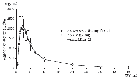 **〈成人〉健康成人にアジルサルタン20mg(12例)及び40mg(12例)を1日1回7日間経口投与した時、未変化体の血漿中濃度は投与開始から4日後までに定常状態に達し、蓄積性はなかった6) 。〈小児〉健康成人(52例)及び2歳以上16歳未満の高血圧症患者(42例)から得られた血漿中アジルサルタン濃度データ(992点)を用いて母集団薬物動態解析を行った。2歳以上6歳未満の高血圧症患者にアジルサルタン0.1~0.8mg/kg、6歳以上16歳未満の高血圧症患者に、アジルサルタンを体重50kg未満の患者では2.5~20mg、体重50kg以上の患者では5~40mgを1日1回反復経口投与した時の母集団薬物動態解析の結果に基づき推定した薬物動態学的パラメータは、以下のとおりであった7) 。