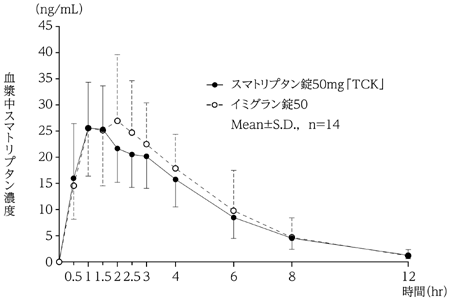 スマトリプタン錠50mg「TCK」とイミグラン錠50を、クロスオーバー法によりそれぞれ1錠(スマトリプタンとして50mg)健康成人男子に絶食単回経口投与して血漿中未変化体濃度を測定し、得られた薬物動態パラメータ(AUC、Cmax)について90%信頼区間法にて統計解析を行った結果、log(0.80)~log(1.25)の範囲内であり、両剤の生物学的同等性が確認された6)。