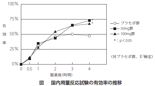 片頭痛患者を対象としたプラセボ対照、用量反応、二重盲検比較試験において、スマトリプタン50mg、100mgの服薬4時間後における有効率はそれぞれ71.4%(50/70例)及び66.7%(46/69例)であり、プラセボと比較し、2時間から3時間後より差がみられ、服薬4時間後において有意に高い有効率を示した17)。