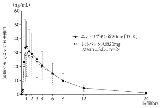 エレトリプタン錠20mg「TCK」とレルパックス錠20mgを、クロスオーバー法によりそれぞれ1錠(エレトリプタン臭化水素酸塩をエレトリプタンとして20mg)健康成人男子に絶食単回経口投与して血漿中エレトリプタン濃度を測定し、得られた薬物動態パラメータ(AUC、Cmax)について90%信頼区間法にて統計解析を行った結果、log(0.80)~log(1.25)の範囲内であり、両剤の生物学的同等性が確認された7)。