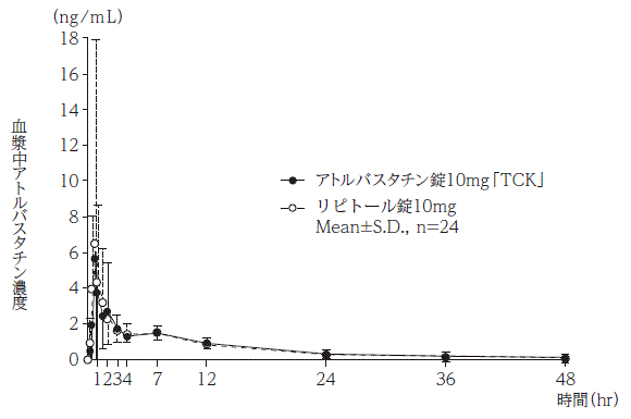 アトルバスタチン錠10mg「TCK」とリピトール錠10mgを、クロスオーバー法によりそれぞれ1錠(アトルバスタチンとして10mg)健康成人男子に絶食単回経口投与して血漿中未変化体濃度を測定し、得られた薬物動態パラメータ(AUC、Cmax)について90%信頼区間法にて統計解析を行った結果、log(0.80)〜log(1.25)の範囲内であり、両剤の生物学的同等性が確認された2)。