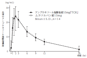 アンブロキソール塩酸塩錠15mg「TCK」とムコソルバン錠15mgを、クロスオーバー法によりそれぞれ1錠(アンブロキソール塩酸塩15mg)健康成人男子に絶食単回経口投与して血清中未変化体濃度を測定し、得られた薬物動態パラメータ(AUC、Cmax)について95%信頼区間法にて統計解析を行った結果、±20%の範囲内であり、両剤の生物学的同等性が確認された1)。