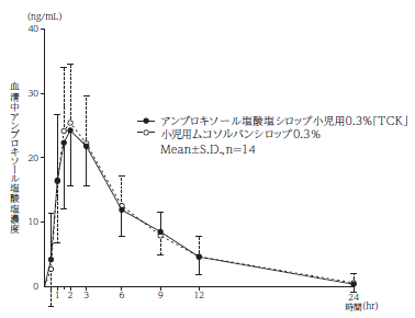 アンブロキソール塩酸塩シロップ小児用0.3%「TCK」と小児用ムコソルバンシロップ0.3%を、クロスオーバー法によりそれぞれ5mL(アンブロキソール塩酸塩15mg)健康成人男子に絶食単回経口投与して血清中未変化体濃度を測定し、得られた薬物動態パラメータ(AUC、Cmax)について95%信頼区間法にて統計解析を行った結果、±20%の範囲内であり、両剤の生物学的同等性が確認された1)。