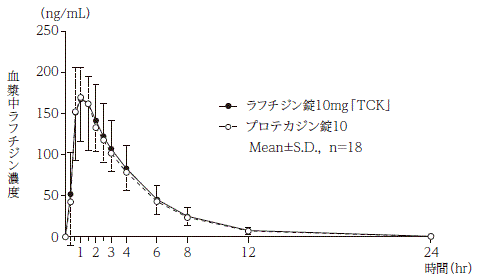 ラフチジン錠10mg「TCK」とプロテカジン錠10を、クロスオーバー法によりそれぞれ1錠(ラフチジン10mg)健康成人男子に絶食単回経口投与して血漿中未変化体濃度を測定し、得られた薬物動態パラメータ(AUC、Cmax)について90%信頼区間法にて統計解析を行った結果、log(0.80)~log(1.25)の範囲内であり、両剤の生物学的同等性が確認された1)。