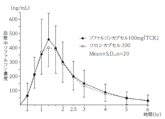 ソファルコンカプセル100mg「TCK」とソロンカプセル100を、クロスオーバー法によりそれぞれ1カプセル(ソファルコン100mg)健康成人男子に絶食単回経口投与して血漿中未変化体濃度を測定し、得られた薬物動態パラメータ(AUC、Cmax)について90%信頼区間法にて統計解析を行った結果、log(0.80)~log(1.25)の範囲内であり、両剤の生物学的同等性が確認された2)。