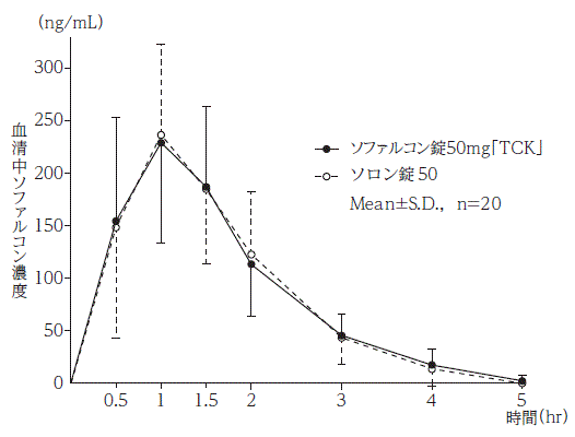 通常、成人にはソファルコンとして1回100mgを1日3回経口投与する。なお、年齢、症状により適宜増減する。