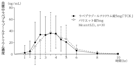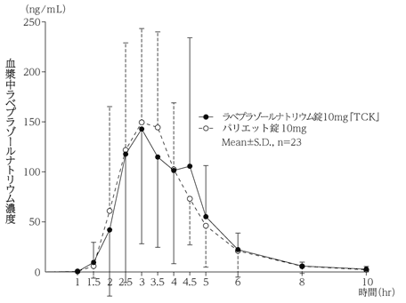 健康成人男子における胃内pHに対し、1日1回5mg投与、1日1回10mg投与、1日1回20mg投与でともに著明な上昇作用を示し、投与5日目の24時間中にpH4以上を示す時間の割合は1日1回5mg投与のEM※で46%、PM※で63%、1日1回10mg投与のEM※で58%、PM※で72%、1日1回20mg投与のEM※で61%、PM※で76%である2)。※肝代謝酵素チトクロームP450 2C19(CYP2C19)表現型は、下記遺伝子型より分類される。 EM(extensive metabolizer):CYP2C19*1/*1、CYP2C19*1/*2又はCYP2C19*1/*3 PM(poor metabolizer):CYP2C19*2/*2、CYP2C19*2/*3又はCYP2C19*3/*3