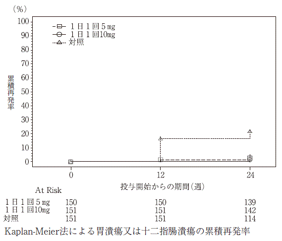 さらに、投与24週以降、ラベプラゾールナトリウムを最大52週間継続投与した場合(累計で最大76週間投与)、Kaplan-Meier法により推定した胃潰瘍又は十二指腸潰瘍の累積再発率は、1日1回5mgで3.7%(95%信頼区間:1.53,8.64)、1日1回10mgで2.2%(95%信頼区間:0.72,6.75)であった。なお、投与24週以降、対照群はラベプラゾールナトリウム1日1回5mg又は1日1回10mgに切り替えて、最大52週間継続投与した24),25),26)。