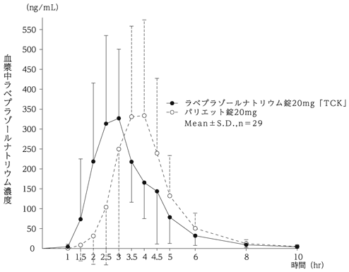 ラベプラゾールナトリウム錠20mg「TCK」とパリエット錠20mgを、クロスオーバー法によりそれぞれ1錠(ラベプラゾールナトリウム20mg)健康成人男子に絶食単回経口投与して血漿中未変化体濃度を測定し、得られた薬物動態パラメータ(AUC、Cmax)について90%信頼区間法にて統計解析を行った結果、log(0.80)〜log(1.25)の範囲内であり、両剤の生物学的同等性が確認された3) 。