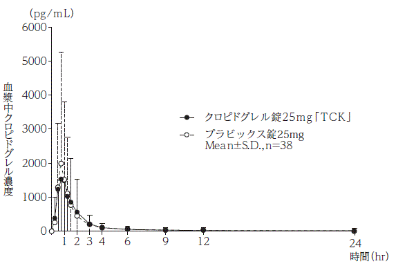 クロピドグレル錠50mg「TCK」は、「含量が異なる経口固形製剤の生物学的同等性試験ガイドライン(平成24年2月29日薬食審査発0229第10号)」に基づき、クロピドグレル錠25mg「TCK」を標準製剤としたとき、溶出挙動が等しく、生物学的に同等とみなされた26)。
