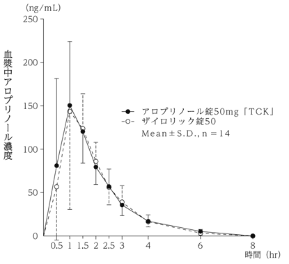 アロプリノール錠50mg「TCK」とザイロリック錠50を、クロスオーバー法によりそれぞれ1錠(アロプリノール50mg)健康成人男子に絶食単回経口投与して血漿中未変化体濃度を測定し、得られた薬物動態パラメータ(AUC、Cmax)について90%信頼区間法にて統計解析を行った結果、log(0.80)~log(1.25)の範囲内であり、両剤の生物学的同等性が確認された7)。
