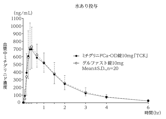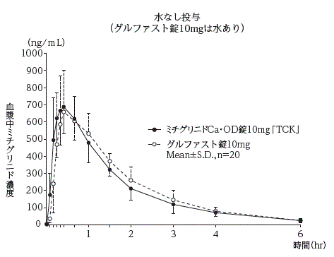 ミチグリニドCa・OD錠10mg「TCK」とグルファスト錠10mgを、クロスオーバー法によりそれぞれ1錠(ミチグリニドカルシウム水和物10mg)健康成人男子に絶食単回経口投与して血漿中未変化体濃度を測定し、得られた薬物動態パラメータ(AUC、Cmax)について90%信頼区間法にて統計解析を行った結果、log(0.80)~log(1.25)の範囲内であり、両剤の生物学的同等性が確認された1)。