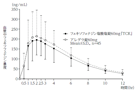 フェキソフェナジン塩酸塩錠60mg「TCK」とアレグラ錠60mgを、クロスオーバー法によりそれぞれ1錠(フェキソフェナジン塩酸塩60mg)健康成人男子に絶食単回経口投与して血漿中未変化体濃度を測定し、得られた薬物動態パラメータ(AUC、Cmax)について90%信頼区間法にて統計解析を行った結果、log(0.80)~log(1.25)の範囲内であり、両剤の生物学的同等性が確認された4)。