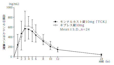 モンテルカスト錠10mg「TCK」とキプレス錠10mgを、クロスオーバー法によりそれぞれ1錠(モンテルカストとして10mg)健康成人男子に絶食単回経口投与して血漿中未変化体濃度を測定し、得られた薬物動態パラメータ(AUC、Cmax)について90%信頼区間法にて統計解析を行った結果、log(0.80)~log(1.25)の範囲内であり、両剤の生物学的同等性が確認された4)。