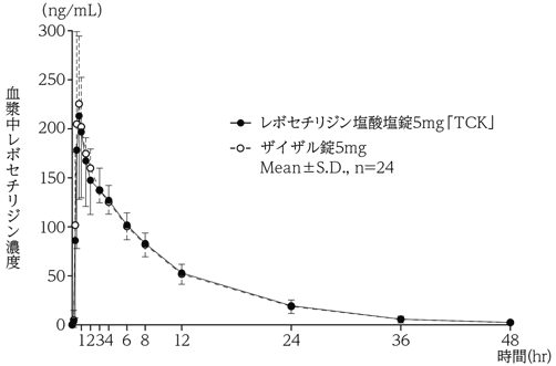レボセチリジン塩酸塩錠5mg「TCK」とザイザル錠5mgを、クロスオーバー法によりそれぞれ1錠(レボセチリジン塩酸塩5mg)健康成人男子に絶食単回経口投与して血漿中レボセチリジン濃度を測定し、得られた薬物動態パラメータ(AUC、Cmax)について90%信頼区間法にて統計解析を行った結果、log(0.80)~log(1.25)の範囲内であり、両剤の生物学的同等性が確認された4)。