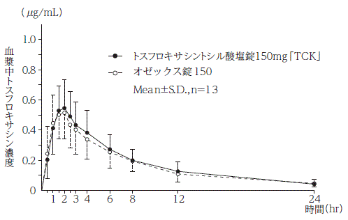 トスフロキサシントシル酸塩錠150mg「TCK」とオゼックス錠150を、クロスオーバー法によりそれぞれ1錠(トスフロキサシントシル酸塩水和物150mg)健康成人男子に絶食単回経口投与して血漿中未変化体濃度を測定し、得られた薬物動態パラメータ(AUC、Cmax)について90%信頼区間法にて統計解析を行った結果、log(0.80)〜log(1.25)の範囲内であり、両剤の生物学的同等性が確認された6)。