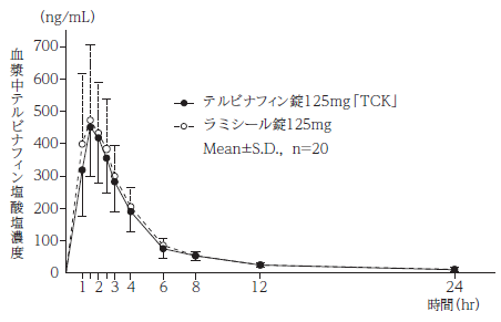 テルビナフィン錠125mg「TCK」とラミシール錠125mgを、クロスオーバー法によりそれぞれ1錠(テルビナフィンとして125mg)健康成人男子に絶食単回経口投与して血漿中未変化体濃度を測定し、得られた薬物動態パラメータ(AUC、Cmax)について90%信頼区間法にて統計解析を行った結果、log(0.80)~log(1.25)の範囲内であり、両剤の生物学的同等性が確認された3) 。