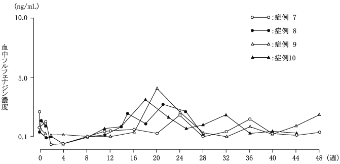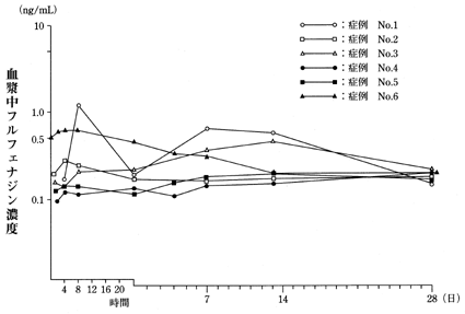 統合失調症患者(4例)にFD25mgを4週間隔で筋肉内投与した試験では、血漿中フルフェナジン濃度は個体差はあるものの5回投与でほぼプラトーに達した。12回にわたる長期投与例においてもプラトーに達した後は血漿中濃度の上昇傾向は認められなかった1)。