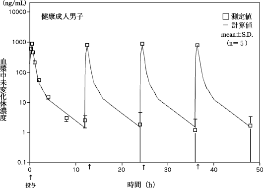 健康成人男子5例に本剤を体重1kg当たり0.5mg、30分かけて1日2回2日間反復点滴静脈内投与したときの血漿中未変化体濃度の推移及び初回投与時の血漿中未変化体濃度推移から求めたパラメータは次のとおりである。蓄積性は認められなかった1)。