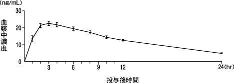 健康成人10例に本剤5mgを単回経口投与した場合、3.1±0.4時間で最高血漿中濃度(23.7±1.0ng/mL)に達し、半減期は8.6±0.3時間であった2)。