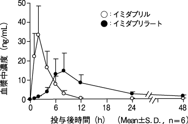 健康成人に本剤10mgを単回経口投与した場合、イミダプリルは投与2時間前後に最高血漿中濃度(Cmax)に達し、以後約2時間の半減期(t1/2)で減少した。一方、活性代謝物であるイミダプリラートの血漿中濃度は投与後6~8時間にCmax(約15ng/mL)に達した後、t1/2約8時間で緩徐に血漿中より消失した3)。