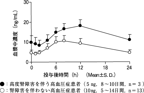 高度腎障害を伴う高血圧症患者3例(血清クレアチニン:3.3、2.9、1.9mg/dL)に本剤5mgを1日1回反復経口投与した時の血漿中イミダプリラート濃度推移は、腎障害を伴わない高血圧症患者13例に10mgを投与した成績と比較すると、最高血漿中濃度到達時間(tmax)の延長(約11時間)ならびにt1/2の延長(約18時間)が認められた。腎障害患者のCmax(約18ng/mL)は腎障害を伴わない患者の値(約11ng/mL)に比べ高かった9),10)。,