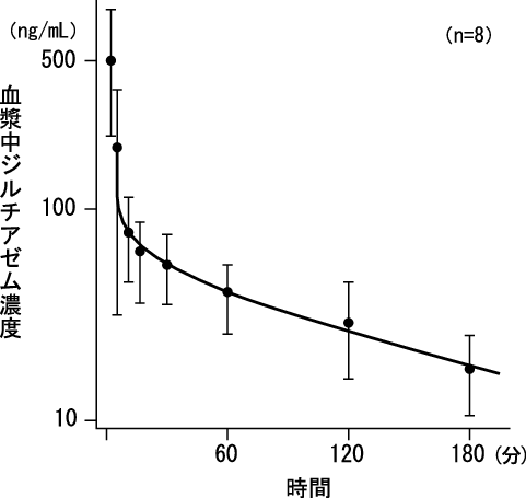 本剤(ジルチアゼム塩酸塩として250mg)は、5mL以上の生理食塩液又はブドウ糖注射液に用時溶解し、次のごとく投与する。