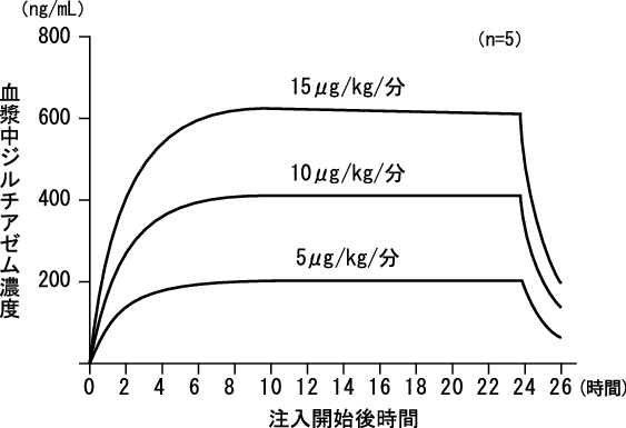 非開心術中の患者5例に本剤を5、10、15μg/kg/分で24時間点滴静注したときの実測値より算出したシミュレーションカーブは下図のとおりである。血漿中濃度は注入速度の増加に従って用量依存的に上昇し、投与開始後5~6時間で定常状態となる。投与終了後は速やかに減少したのち緩やかに消失する2)。