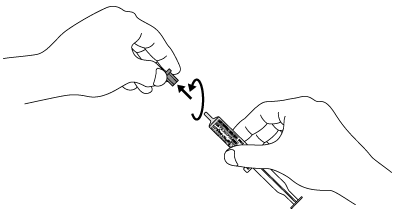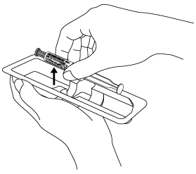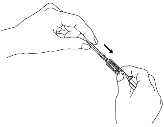 注意:キャップを矢印の方向にねじりながらゆっくりと引き外す。キャップを外した後、シリンジ先端部に触れないこと。