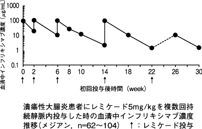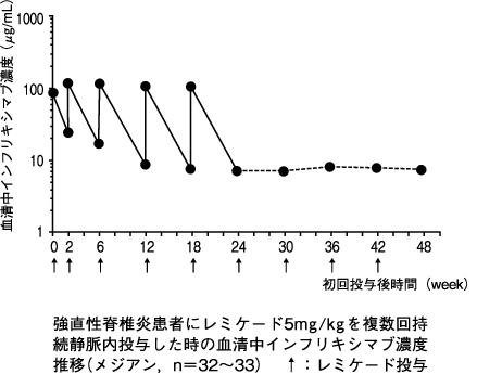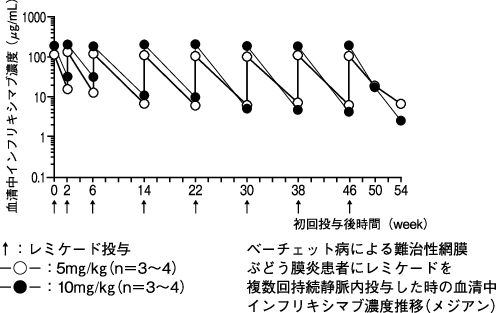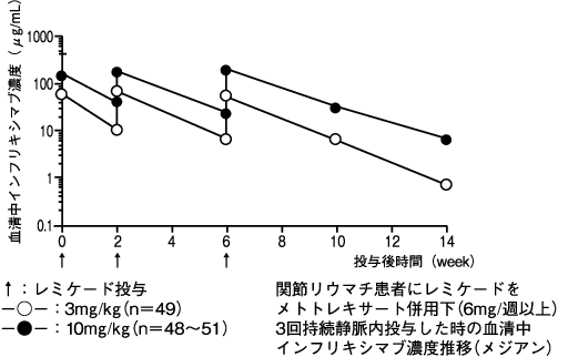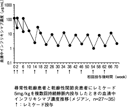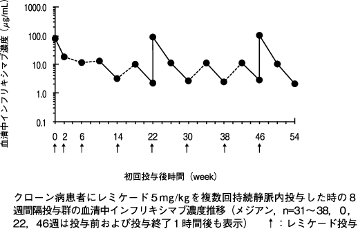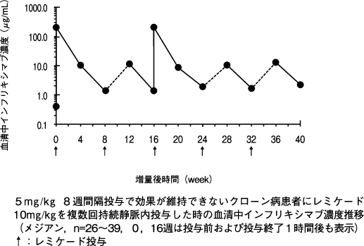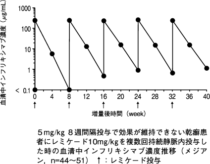 本剤5mg/kg 8週間隔投与で効果が維持できない患者5例に本剤10mg/kgを投与したときの8週後の血清中濃度は、増量前と比較して増加した。10mg/kgの投与を受けた5例において本剤に対する抗体は検出されなかった。