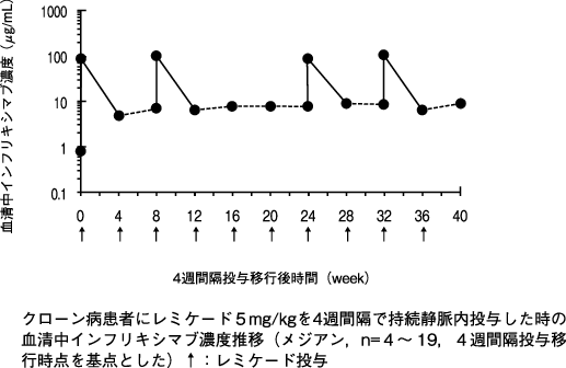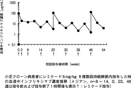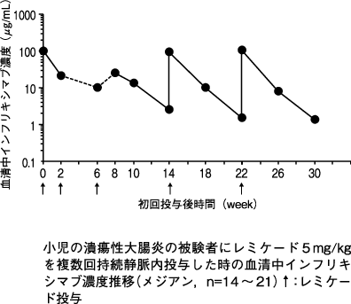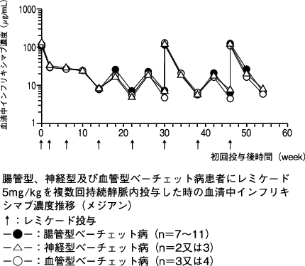 本剤5mg/kg 8週間隔投与で効果が維持できない腸管型ベーチェット病患者3例に本剤10mg/kgを投与したときの8週後の血清中濃度は、増量前と比較して増加した。10mg/kgの投与を受けた3例において本剤に対する抗体は検出されなかった。