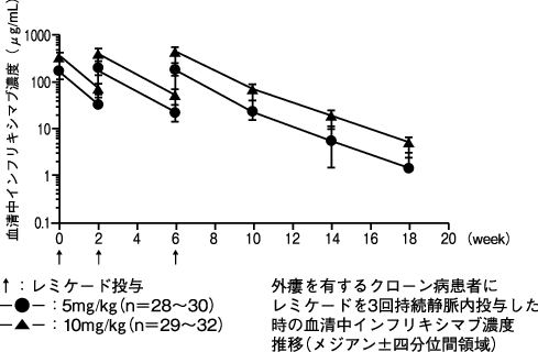 本剤5mg/kgを単回静脈内投与したときの最高血中濃度(Cmax)は69.80±9.26μg/mL(平均値±標準偏差)、69.73μg/mL(中央値)、消失半減期は179.3±71.2時間(平均値±標準偏差)、183.8時間(中央値)であった。本剤投与56日後には16例中11例の血清中インフリキシマブ濃度が定量下限値(0.1μg/mL)未満であった。5mg/kgの単回投与を受けた16例では7例に本剤に対する抗体が検出された。