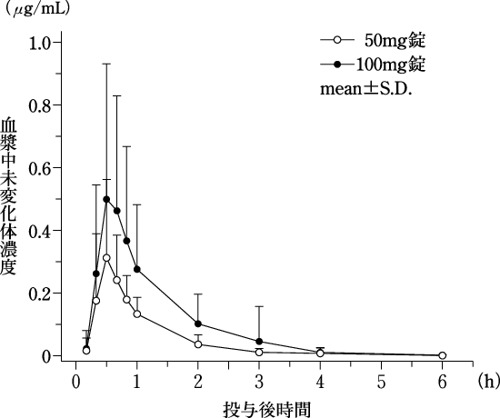 健康成人男子30例にアンプラーグ錠の50mg及び100mgを絶食時単回経口投与したときの血漿中未変化体濃度及び薬物動態パラメータは次のとおりである1)。