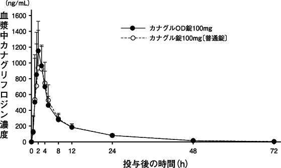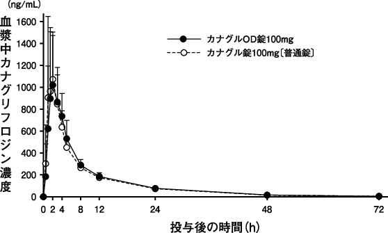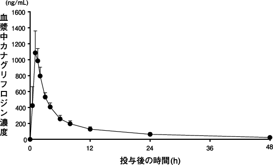 2型糖尿病患者に、カナグリフロジンとして100mgを食事10分前に単回経口投与したときの血漿中濃度推移及び薬物動態パラメータは以下のとおりである3)。