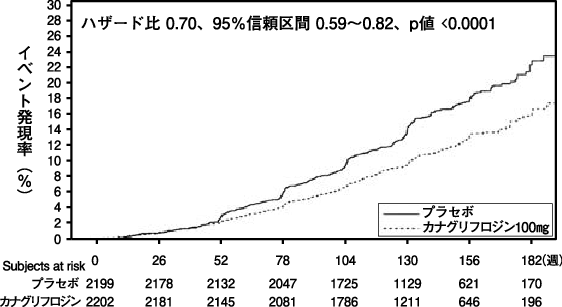 eGFRが30~90mL/min/1.73m2、UACRが300~5000mg/gCr、かつACE阻害薬又はARBを服用している、2型糖尿病を合併する慢性腎臓病患者(4401例)を対象に、カナグリフロジン又はプラセボを1日1回、115週間(平均値)投与した(本剤群2202例(日本人57例)、プラセボ群2199例(日本人53例))。結果は次表のとおりであった。なお、非糖尿病性の腎臓病と診断された患者は除外された。また、本剤投与中にeGFRが30mL/min/1.73m2未満に低下した場合も本剤投与を継続可とした。副作用は本剤群2200例中469例(21.3%)及びプラセボ群2197例中361例(16.4%)に認められた。主な副作用は低血糖が本剤群100例(4.5%)及びプラセボ群92例(4.2%)、尿路感染が本剤群80例(3.6%)及びプラセボ群49例(2.2%)、高カリウム血症が本剤群35例(1.6%)及びプラセボ群24例(1.1%)、血中クレアチニン増加が本剤群30例(1.4%)及びプラセボ群20例(0.9%)、糸球体濾過率減少が本剤群22例(1.0%)及びプラセボ群21例(1.0%)であった2)。