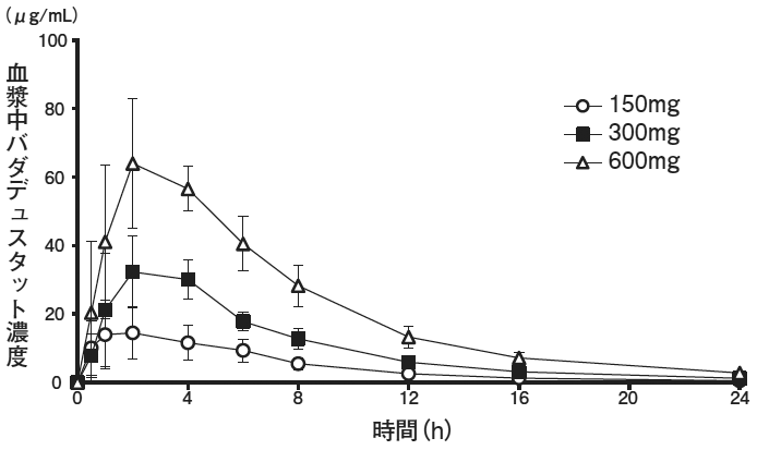 健康成人に、バダデュスタット150mg、300mg及び600mgを1日1回10日間反復投与した際の投与1日目の平均血漿中濃度推移及び薬物動態パラメータは以下のとおりである4)。